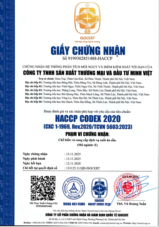 Với quy trình làm việc nghiêm túc, nguồn thực phẩm tươi sạch và sự chăm sóc tận tâm từng ngày, bếp ăn Minh Việt đã và đang trở thành niềm tin vững chắc của phụ huynh, niềm vui của học sinh, và là minh chứng cho tinh thần trách nhiệm trong công tác nuôi dưỡng học đường.