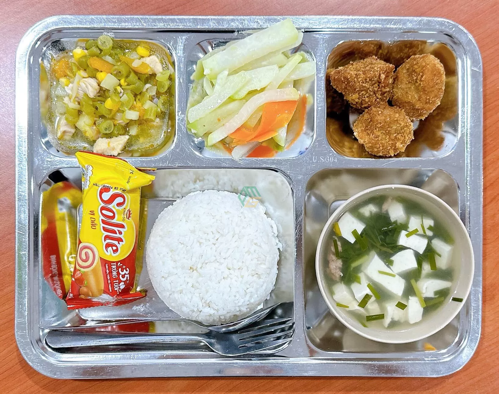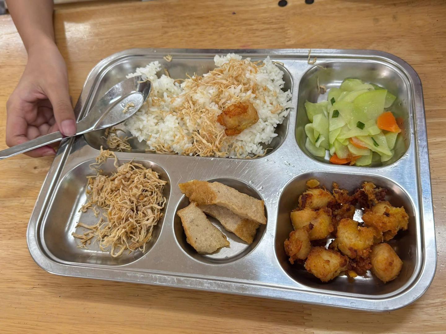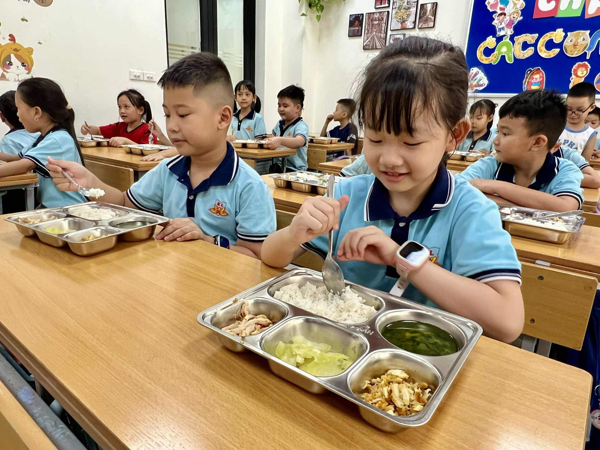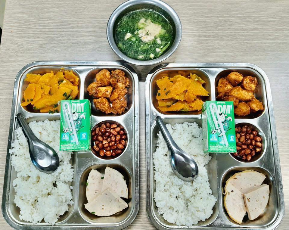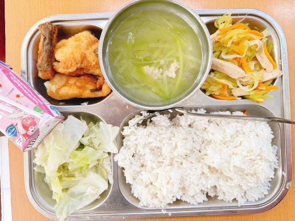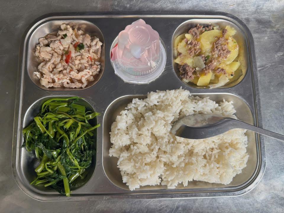 Các món ăn được chế biến đậm đà, vừa miệng, đầy đặn và hấp dẫn, phù hợp khẩu vị trẻ em. Từ cơm thịt kho trứng, canh rau ngót nấu thịt, cá chiên giòn, đến canh chua cá, thịt rim tôm, rau xào tỏi, tráng miệng trái cây tươi — tất cả đều được trình bày đẹp mắt và đảm bảo nóng hổi khi đến tay học sinh.